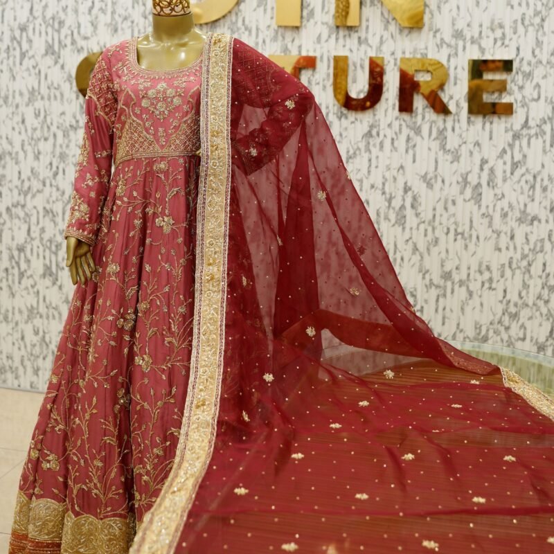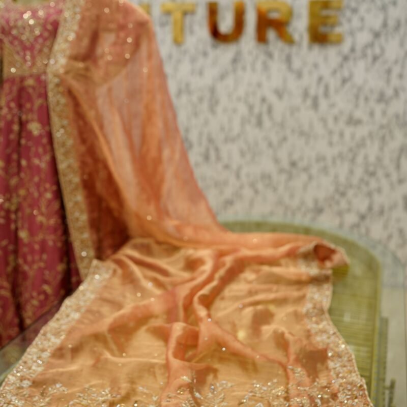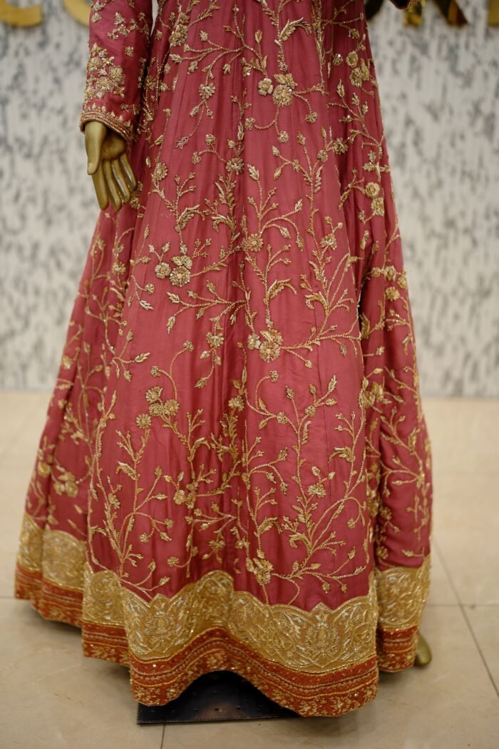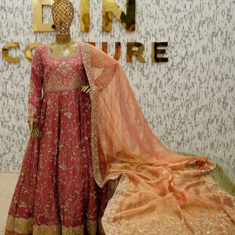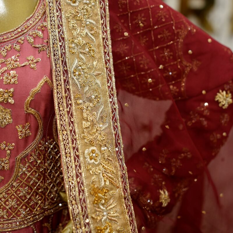 Make a majestic entrance in the Zarnigar Tail Lehenga Set, a stunning custom-designed wedding ensemble in a soft dusty pink hue (customisable). The fitted-body maxi is crafted from pure chandi tissue, featuring intricate hand embellishments with dabka, delicate sequins, pearls, and Italian stone work, adding refined sparkle and depth. Paired with a dramatic farshi-style tail lehenga in pure lama tissue, this design brings grandeur and fluid movement to every step. The set is completed with a 4-yard chandi tissue dupatta, adding sheer elegance and coverage. This ensemble is fully lined for structure and comfort, making it ideal for brides or formal occasions that call for unmatched grace and detail. sophistication and royalty. All design elements, from embroidery to fabric and bottom style, can be fully customised to your preference.