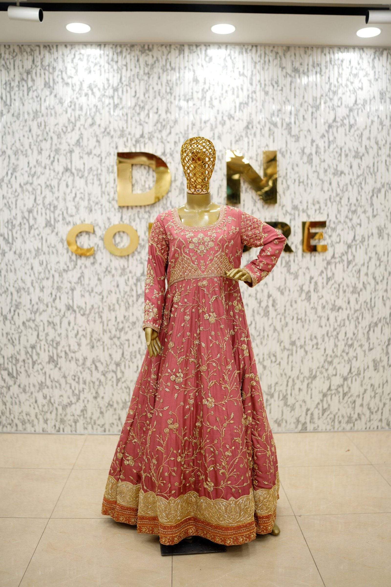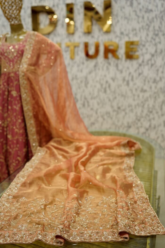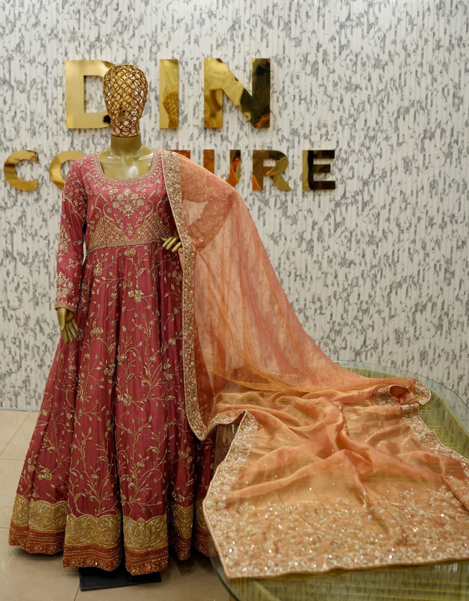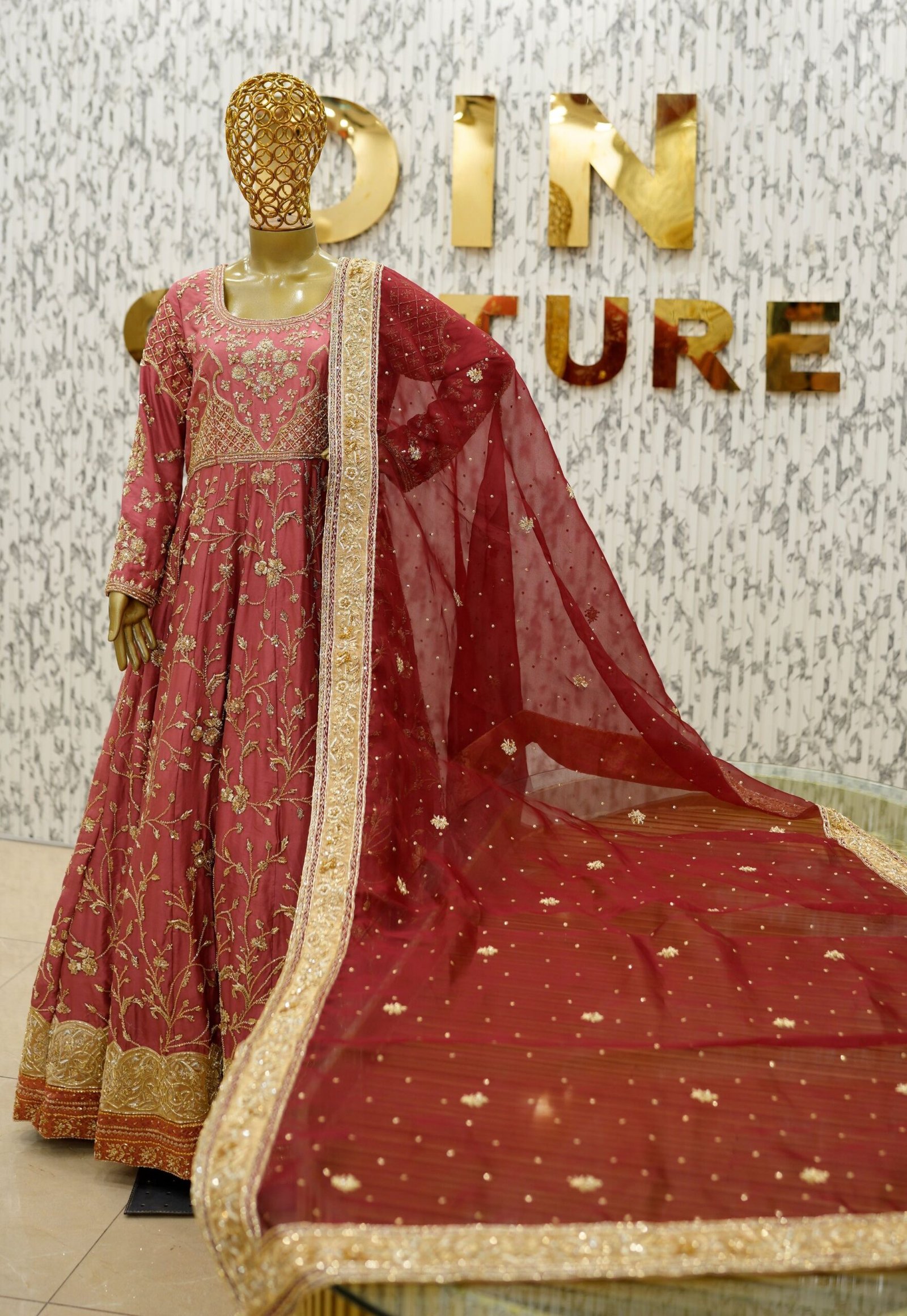 Make a majestic entrance in the Zarnigar Tail Lehenga Set, a stunning custom-designed wedding ensemble in a soft dusty pink hue (customisable). The fitted-body maxi is crafted from pure chandi tissue, featuring intricate hand embellishments with dabka, delicate sequins, pearls, and Italian stone work, adding refined sparkle and depth. Paired with a dramatic farshi-style tail lehenga in pure lama tissue, this design brings grandeur and fluid movement to every step. The set is completed with a 4-yard chandi tissue dupatta, adding sheer elegance and coverage. This ensemble is fully lined for structure and comfort, making it ideal for brides or formal occasions that call for unmatched grace and detail. sophistication and royalty. All design elements, from embroidery to fabric and bottom style, can be fully customised to your preference.