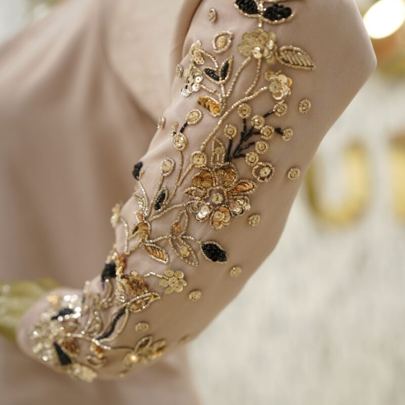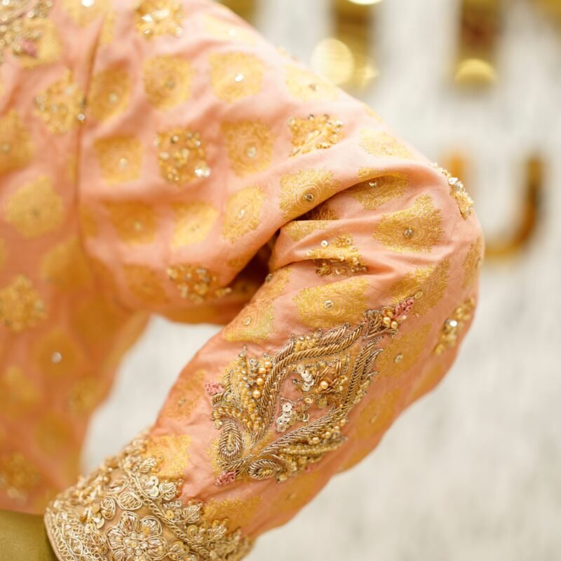 Heritage Peach is a graceful expression of traditional elegance, rendered in a delicate dusty peach hue. This custom-made three-piece ensemble includes a loose-fit shirt crafted in pure 80g raw silk, fully lined for comfort. It is subtly adorned with gold embellishments on the shoulders, sleeves, and hem — adding gentle sparkle without overwhelming the look.