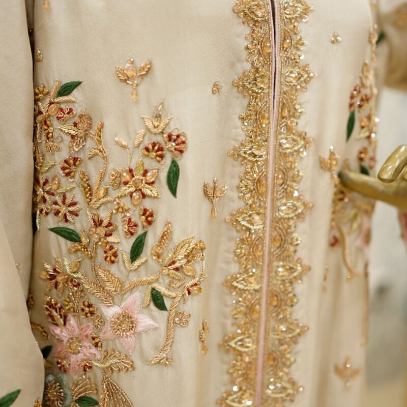 The set features a flared sharara in pure Korean silk, also embellished at the hem, offering both movement and grace. Completing the look is a pure katan silk organza dupatta, adding a touch of airiness and flow, perfect for festive events or intimate wedding ceremonies.