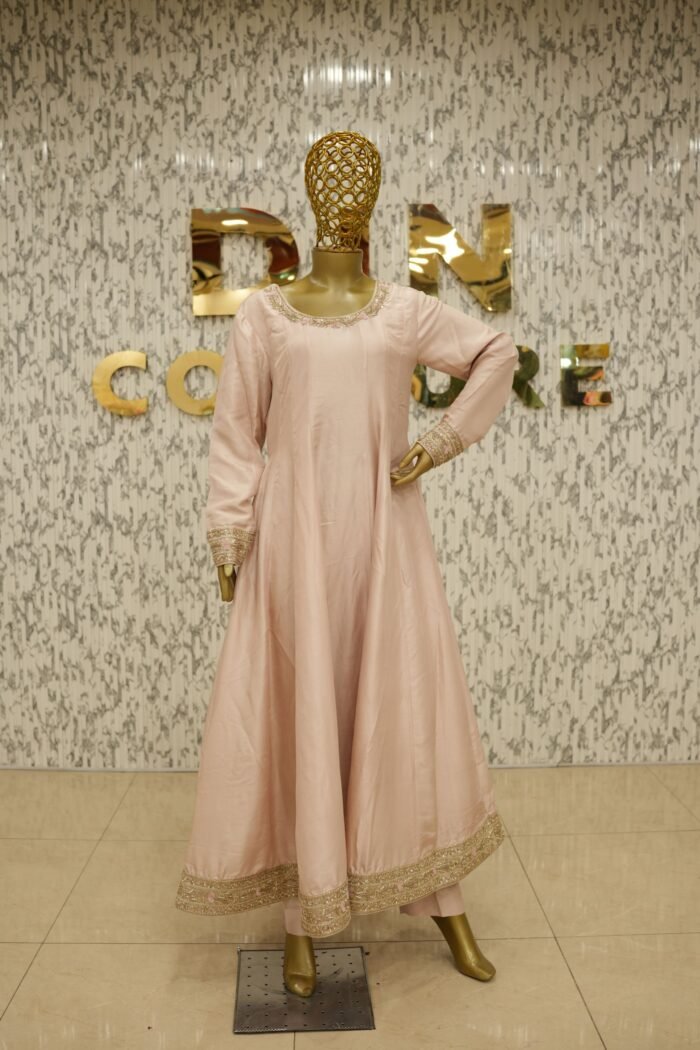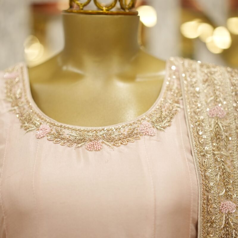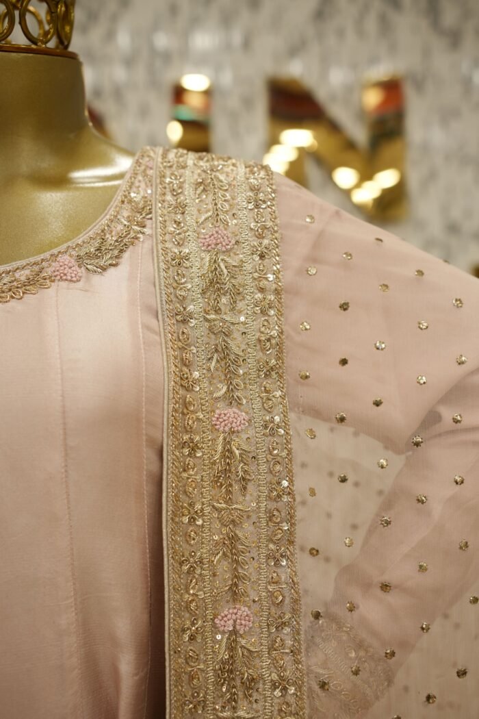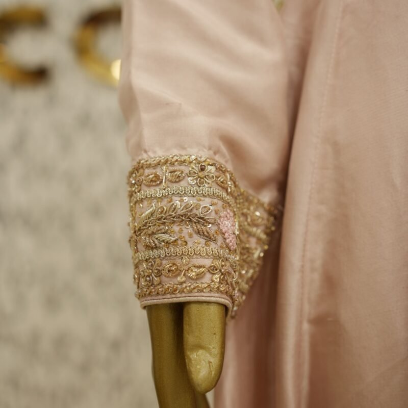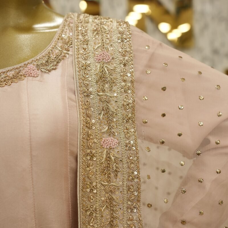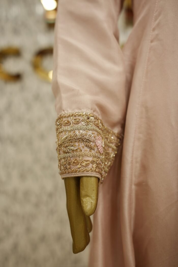 Introducing the Meher Dusty Pink Frock – a stunning customised ensemble designed for timeless grace. This Anarkali-style pishwas is crafted in pure 80g raw silk, featuring fully handworked flare with intricate zardozi detailing and tone-on-tone resham embroidery in a slightly deeper pink, creating a layered and elegant visual. The piece is fully lined for comfort and finish. Paired with a sheer pure kamdani mukaish dupatta and azaar pants in matching silk, the ensemble radiates sophistication and royalty. All design elements, from embroidery to fabric and bottom style, can be fully customised to your preference.