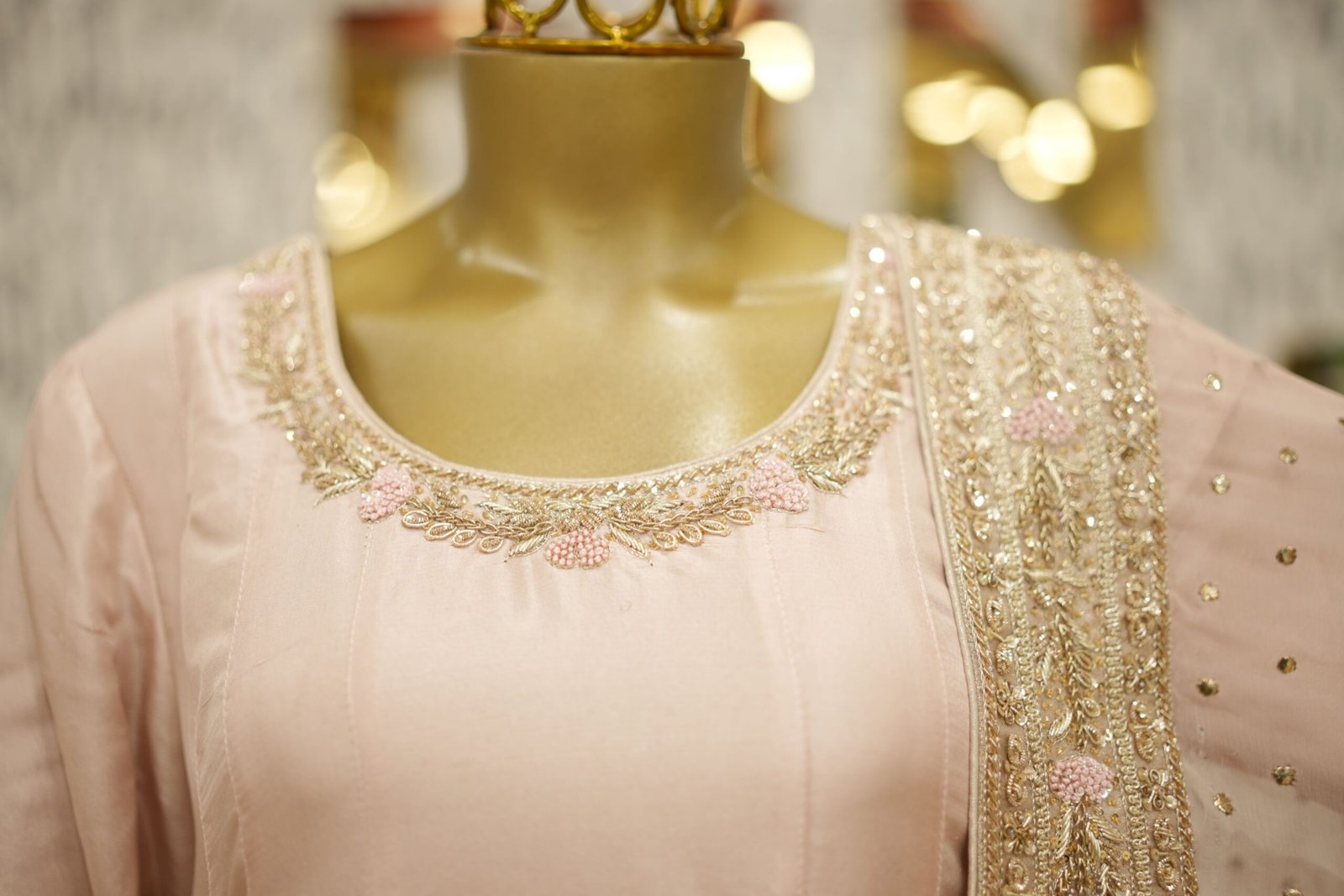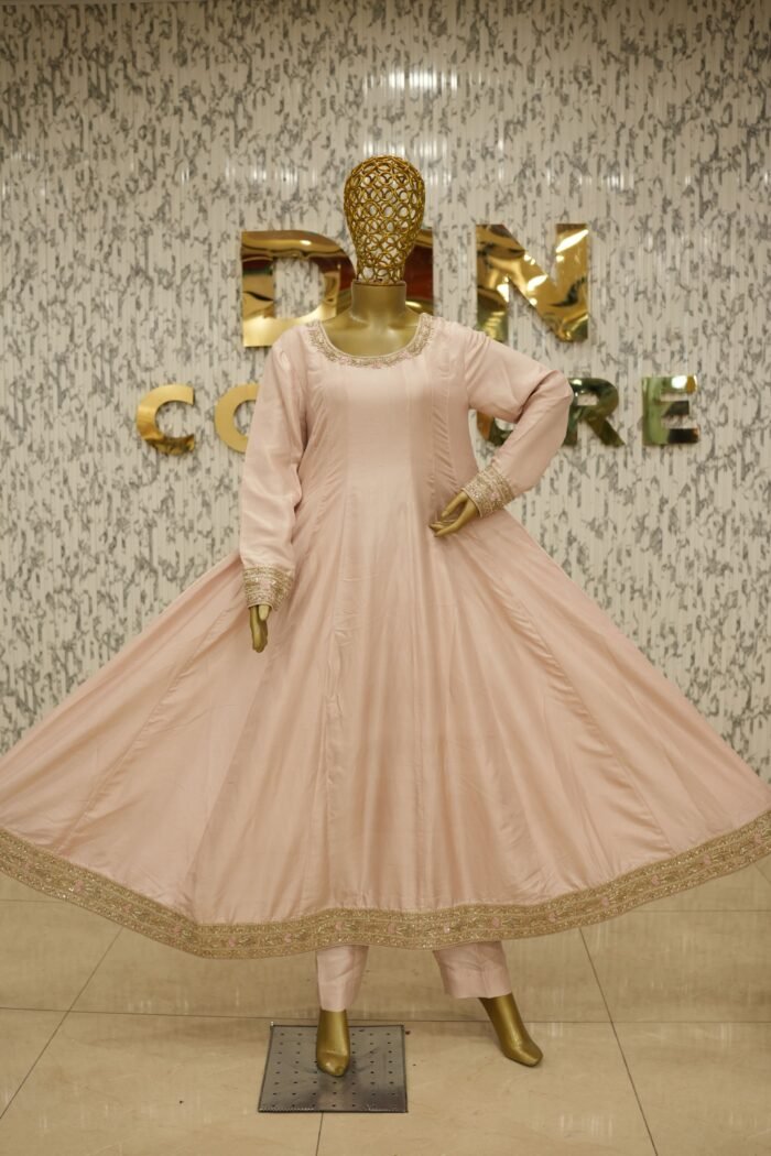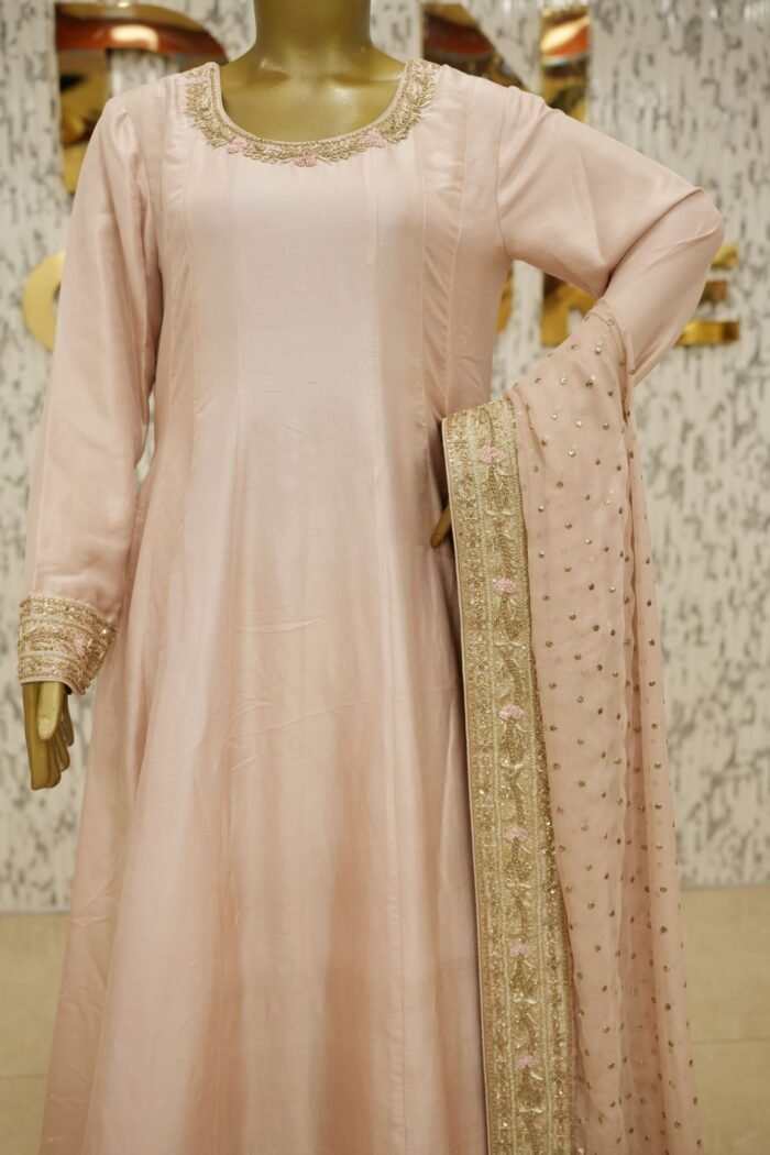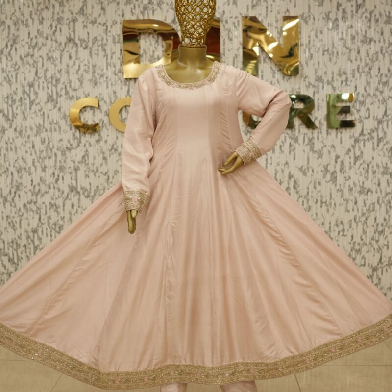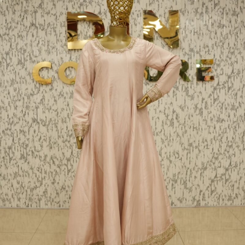 Introducing the Meher Dusty Pink Frock – a stunning customised ensemble designed for timeless grace. This Anarkali-style pishwas is crafted in pure 80g raw silk, featuring fully handworked flare with intricate zardozi detailing and tone-on-tone resham embroidery in a slightly deeper pink, creating a layered and elegant visual. The piece is fully lined for comfort and finish. Paired with a sheer pure kamdani mukaish dupatta and azaar pants in matching silk, the ensemble radiates sophistication and royalty. All design elements, from embroidery to fabric and bottom style, can be fully customised to your preference.