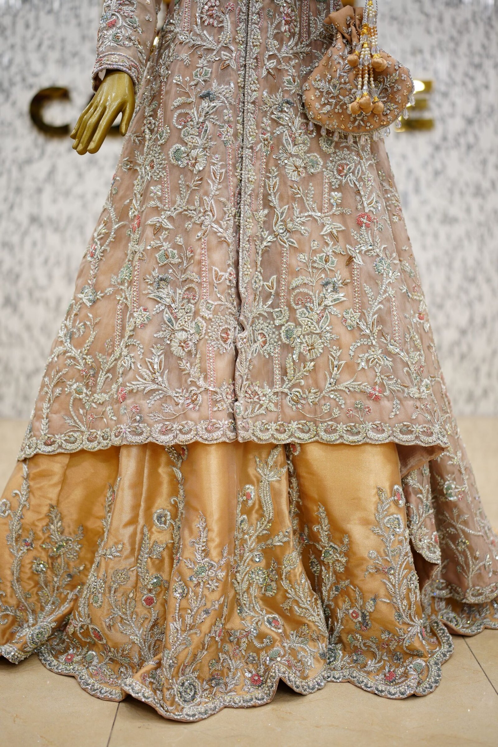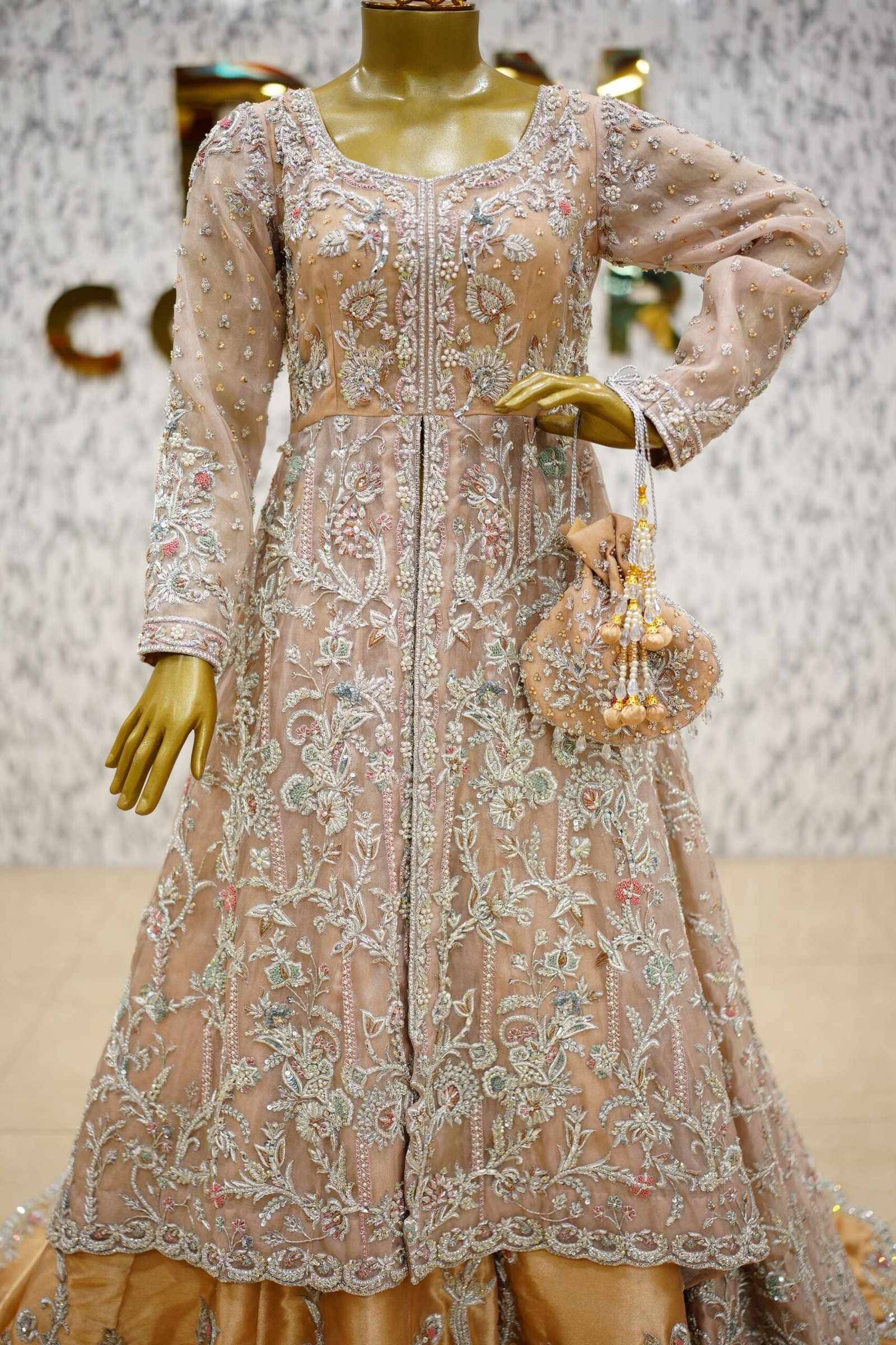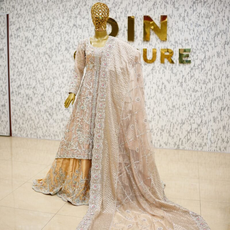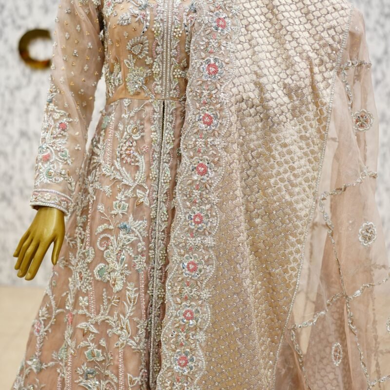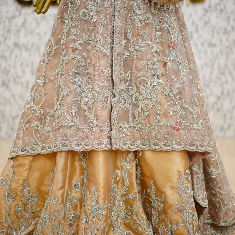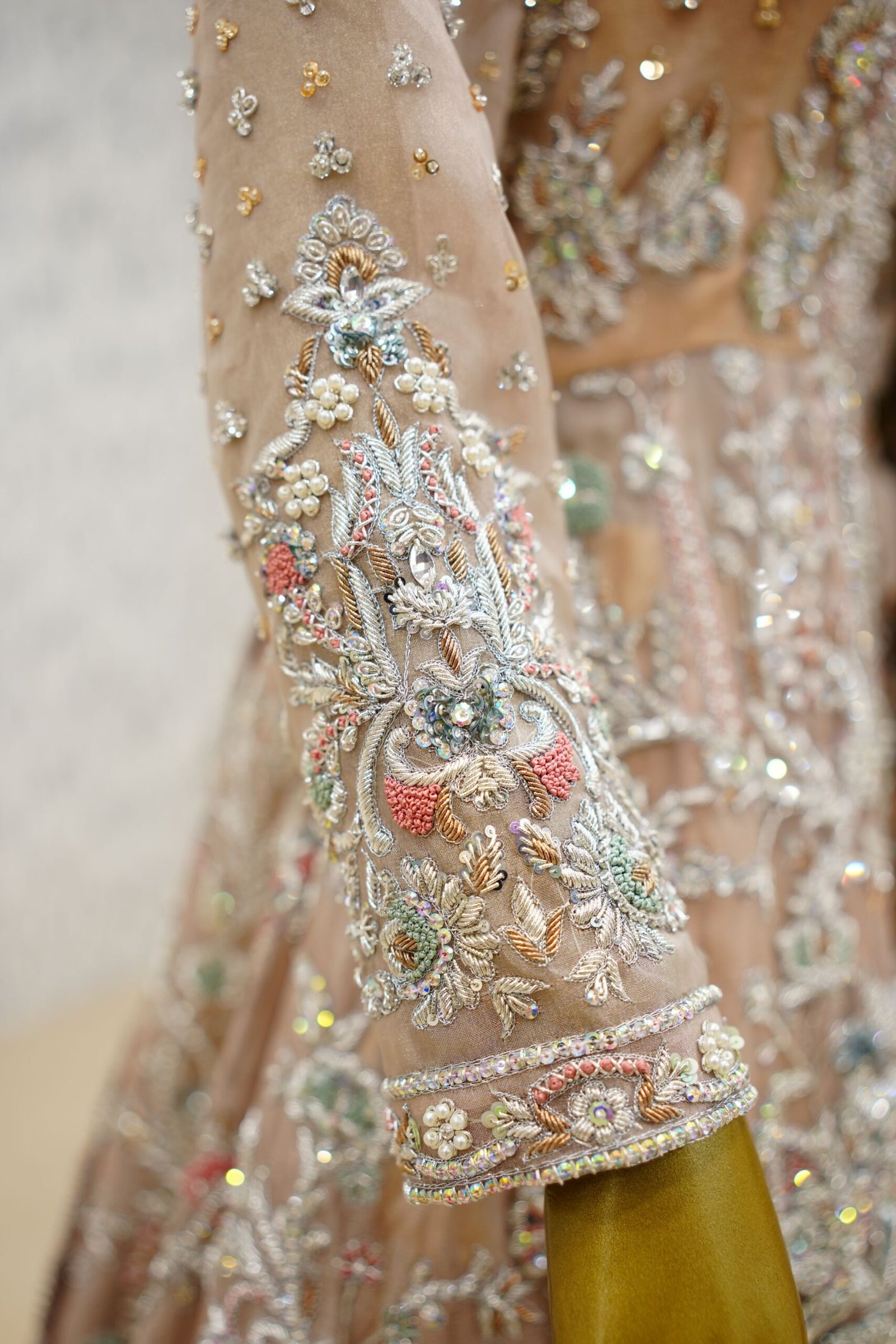 Make a majestic entrance in the Zarnigar Tail Lehenga Set, a stunning custom-designed wedding ensemble in a soft dusty pink hue (customisable). The fitted-body maxi is crafted from pure chandi tissue, featuring intricate hand embellishments with dabka, delicate sequins, pearls, and Italian stone work, adding refined sparkle and depth. Paired with a dramatic farshi-style tail lehenga in pure lama tissue, this design brings grandeur and fluid movement to every step. The set is completed with a 4-yard chandi tissue dupatta, adding sheer elegance and coverage. This ensemble is fully lined for structure and comfort, making it ideal for brides or formal occasions that call for unmatched grace and detail. sophistication and royalty. All design elements, from embroidery to fabric and bottom style, can be fully customised to your preference.