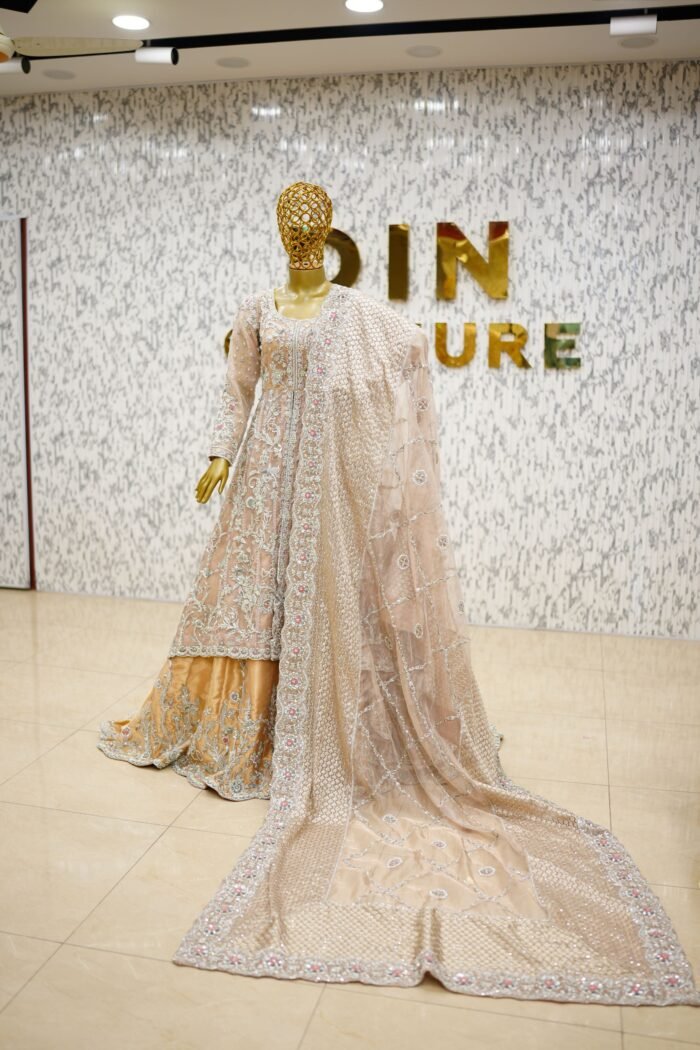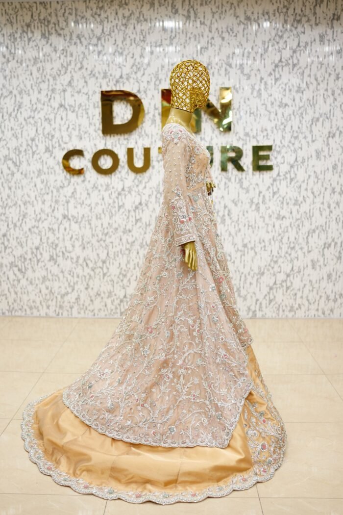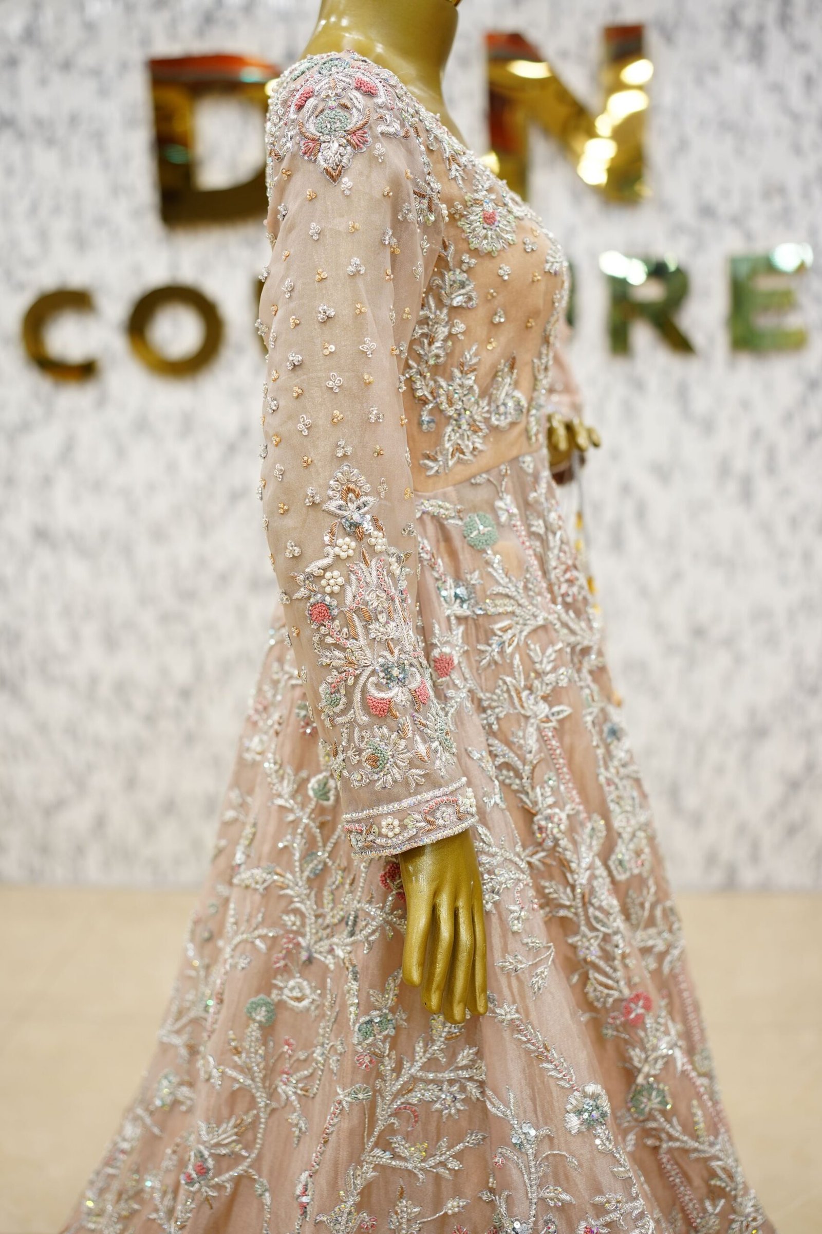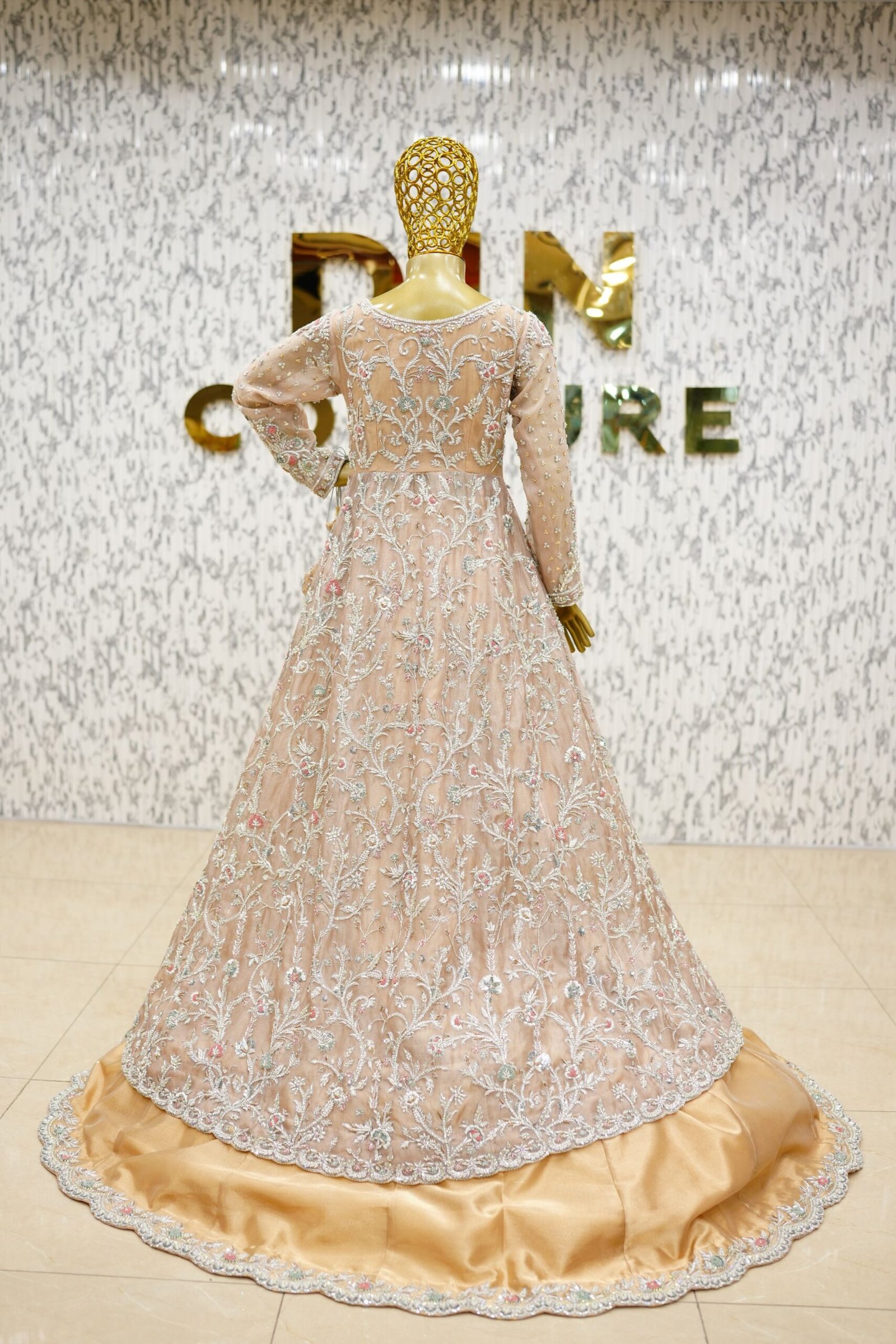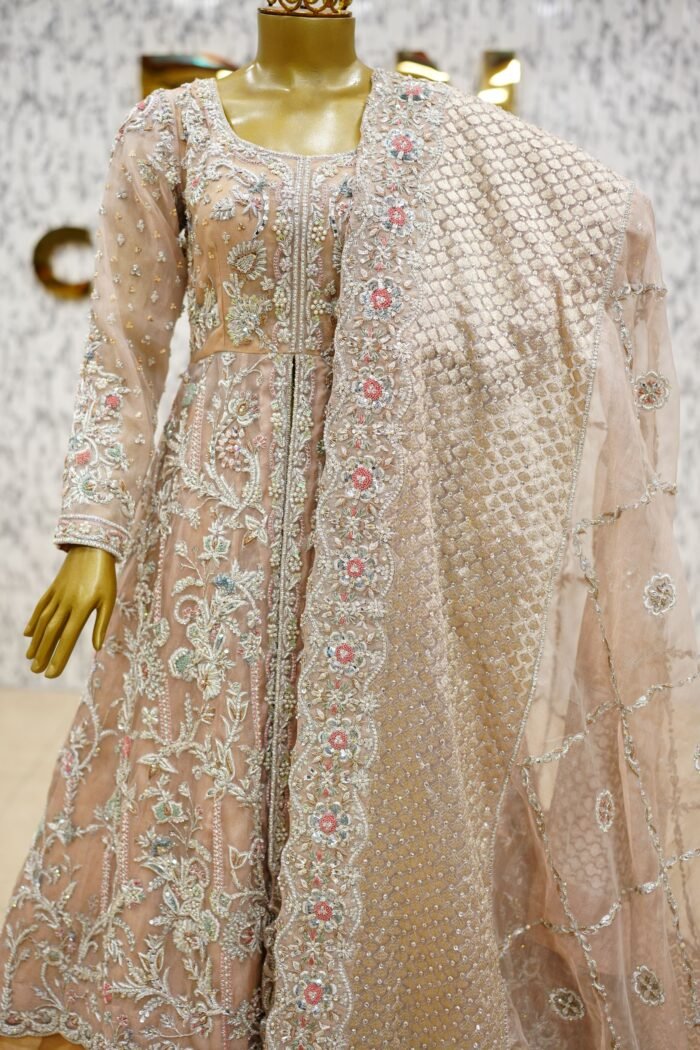 Make a majestic entrance in the Zarnigar Tail Lehenga Set, a stunning custom-designed wedding ensemble in a soft dusty pink hue (customisable). The fitted-body maxi is crafted from pure chandi tissue, featuring intricate hand embellishments with dabka, delicate sequins, pearls, and Italian stone work, adding refined sparkle and depth. Paired with a dramatic farshi-style tail lehenga in pure lama tissue, this design brings grandeur and fluid movement to every step. The set is completed with a 4-yard chandi tissue dupatta, adding sheer elegance and coverage. This ensemble is fully lined for structure and comfort, making it ideal for brides or formal occasions that call for unmatched grace and detail. sophistication and royalty. All design elements, from embroidery to fabric and bottom style, can be fully customised to your preference.